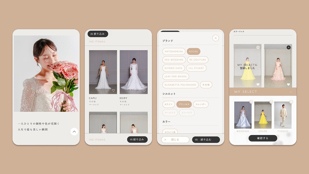 ドレスの魅力を最大限に引き出すため、スムーズないインタラクションや出現アニメーション演出を設計。ユーザーがドレスを「見る」体験そのものを楽しめる設計を目指しました。